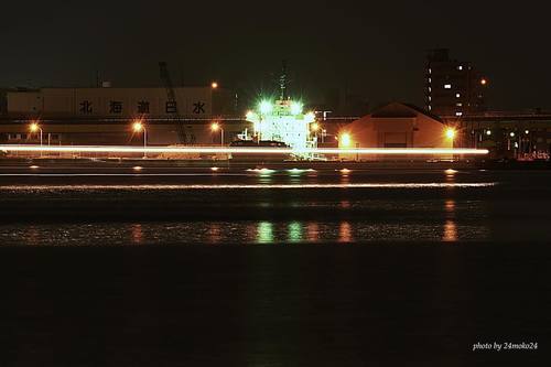 海王丸と函館ドック...海面に映る灯りが綺麗な夜でした