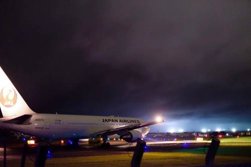 生憎の雨降りでしたが最終便の飛び立つ時刻は誘導灯&漁火のダブル夜景を楽しめます♬