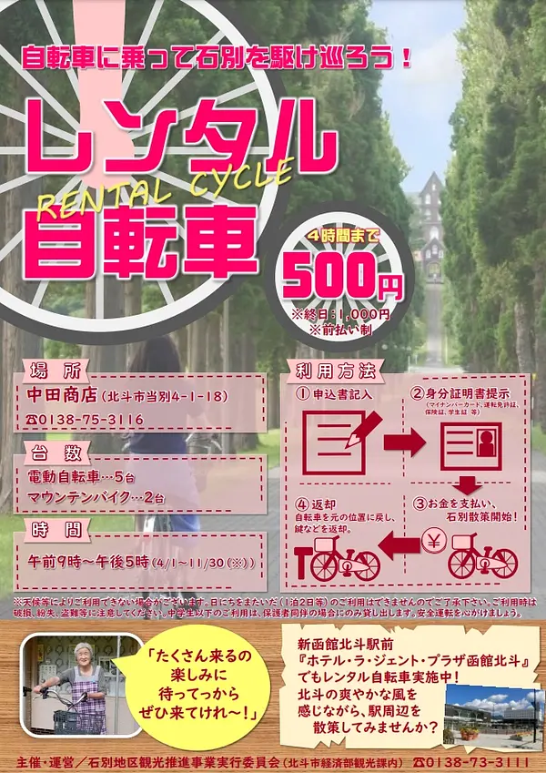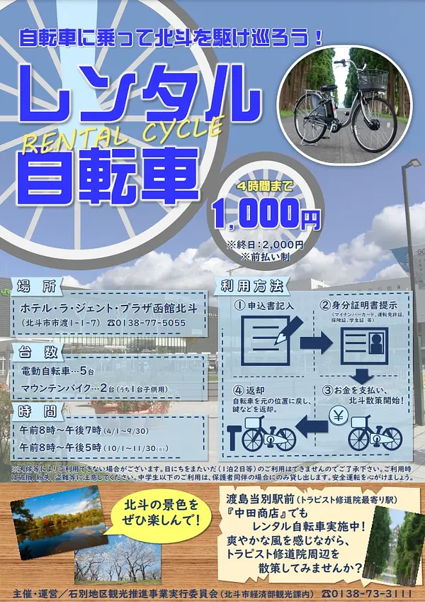 また、北海道新幹線終点の新函館北斗駅前にもレンタサイクルサービスがあります。北斗市の桜の名所や、公園などを訪ねるのにおすすめです。