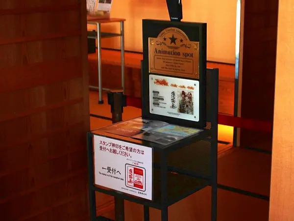 箱館奉行所の入口右手には、「薄桜鬼 真改」のアニメ聖地認定プレートとリーフレットを設置。ご朱印スタンプは入口左手の受付カウンターにあります(要入館料)。