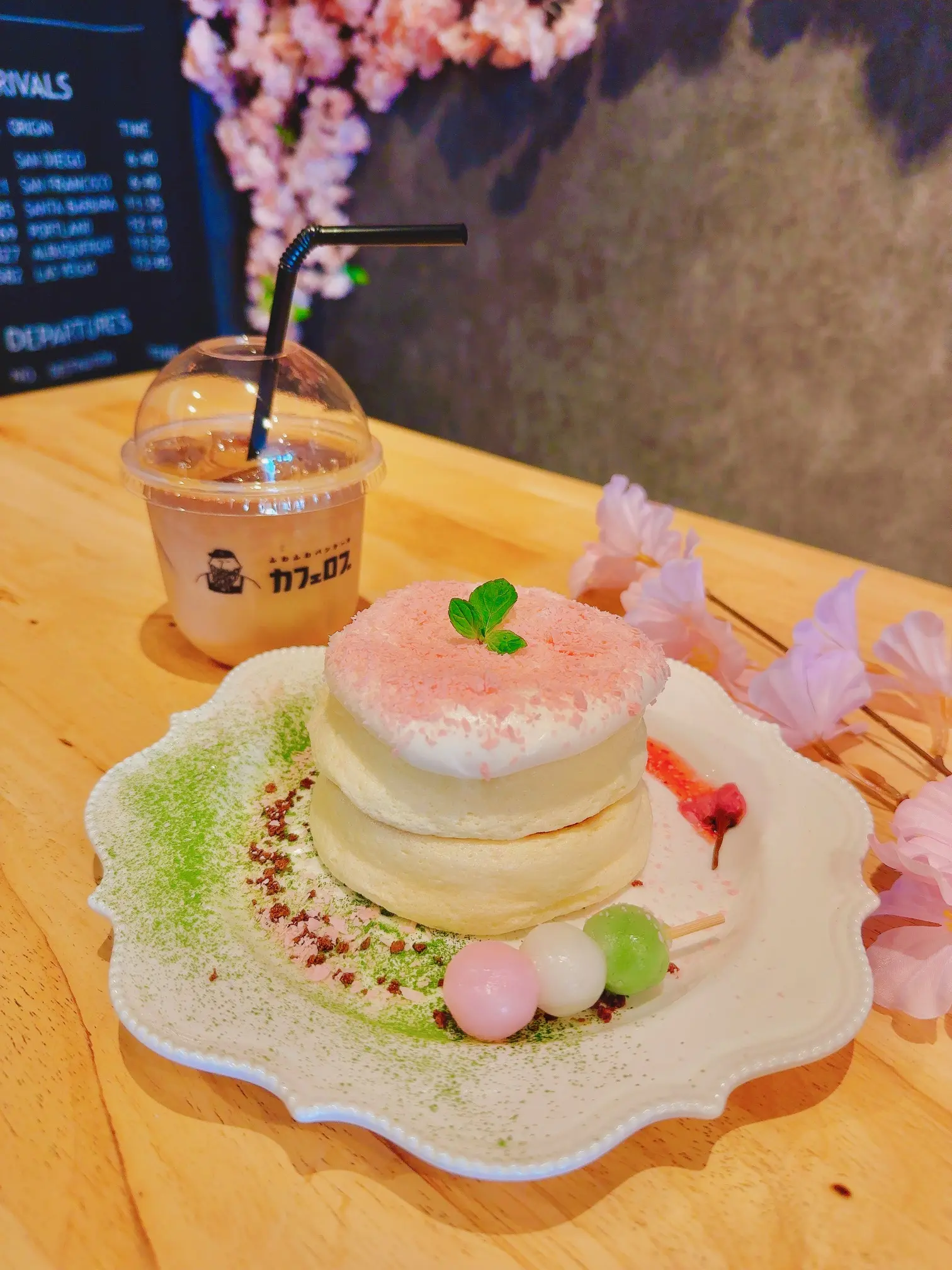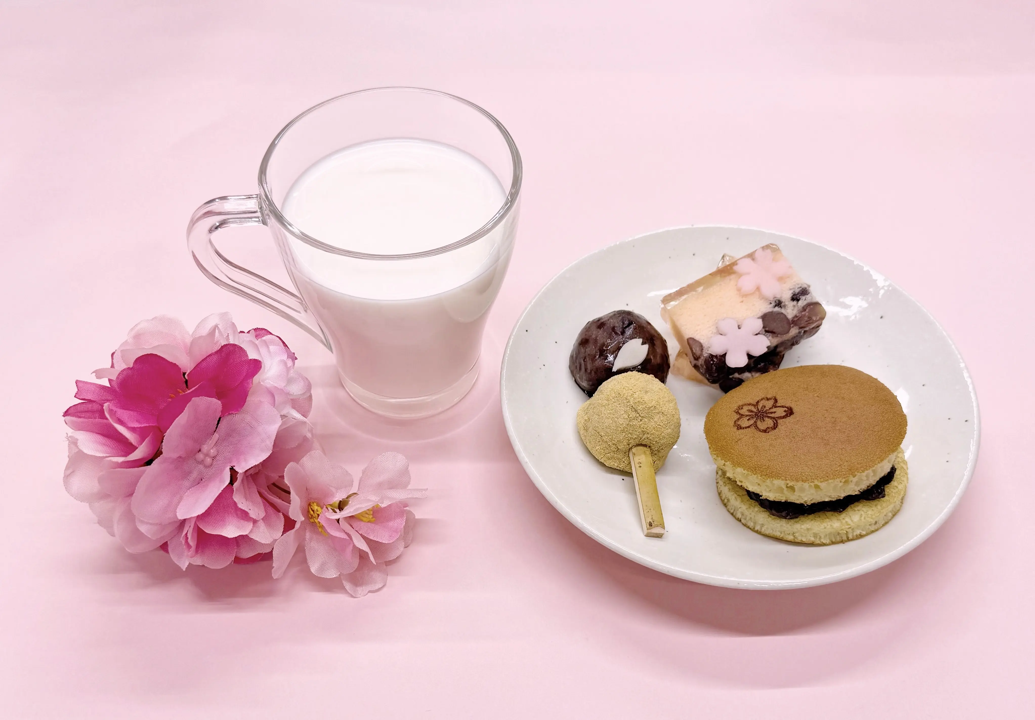 ・桜ミルクと甘味セット(桜焼き印入りのどらやき・串だんご・上生菓子「花らんまん」)
