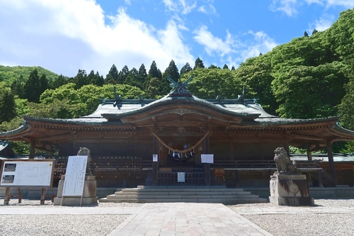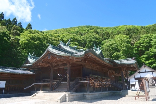 創建は室町時代の1445年。1880(明治13)年からこの地に移り、現在の社殿は1915(大正4)年に建てられました。聖帝造り(藤原時代の寝殿造りの後方の一間を切り取った形)に、八棟造り(本殿と拝殿とを中殿で連結)を合わせた、「聖帝八棟造り(しょうていはちまんづくり)」の荘厳なたたずまい。