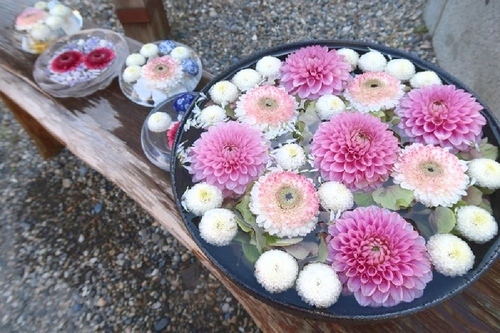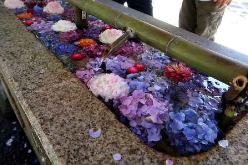 運がよければ、境内にさまざまな花手水が飾られているのに出会えるかも。