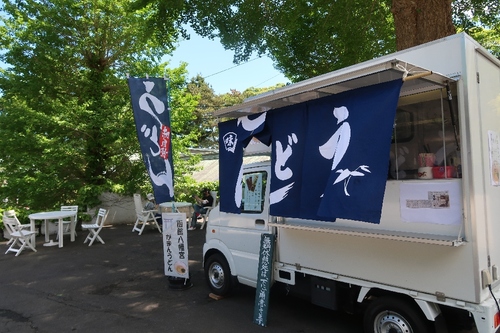 境内には、ひときわ目を引くキッチンカーが1台。神社自らが2021年に導入し、「いろいろと困難が多く、がまんを強いられる時代に、神社をお参りして元気を出してほしい」という気持ちをこめて、「がまんうどん」を提供しています。