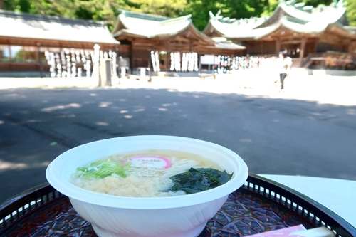 だしのきいた澄んだつゆに、うどん、揚げ玉、わかめ、ねぎと、「がまんうどん 函八」と刻印されたかまぼこ入り。境内のテーブルや、屋内の無料休憩所で食べられます。土日祝11時から14時まで提供、小(写真)300円。並500円もあります。