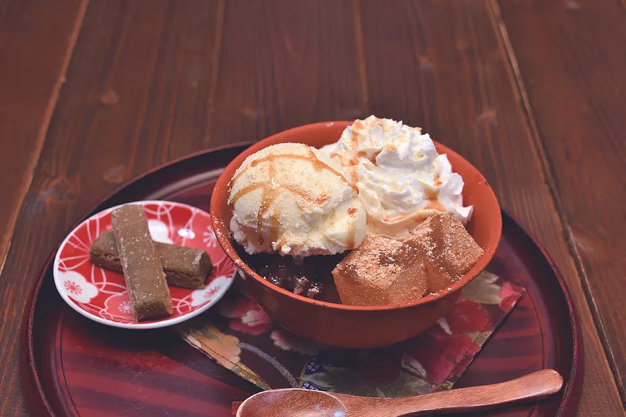 大正10年建築の、質蔵を改造した喫茶&アンティークショップ。時の流れに思いをはせながら、自家製の寒天と黒蜜を使用したあんみつなどの甘味・軽食が楽しめる。