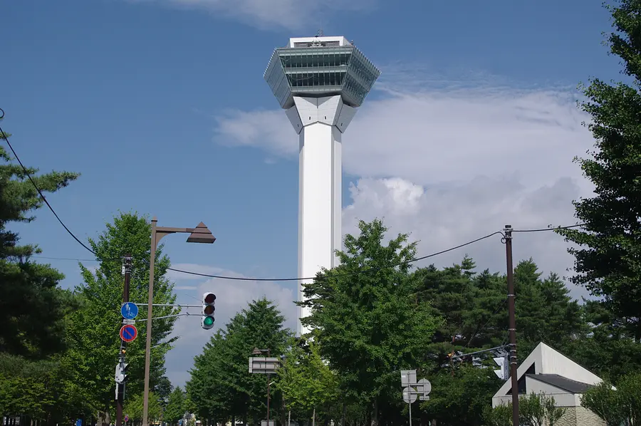 五稜郭公園に隣接して建ち、展望フロアから五稜郭跡の星形を俯瞰できるタワー。展望2階の高さは地上90メートル。五稜郭や箱館戦争の歴史を語る展示物も興味深い。