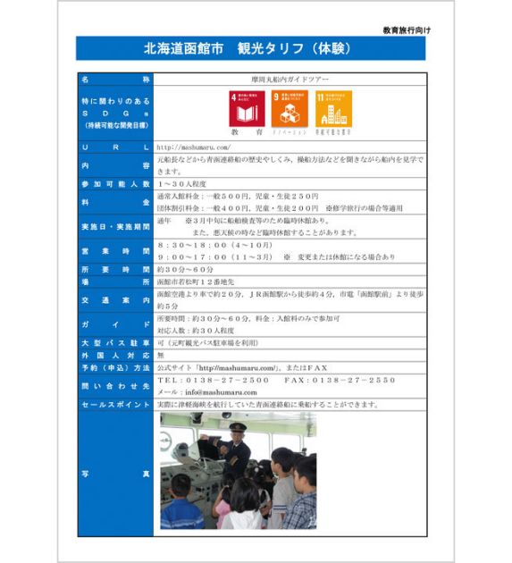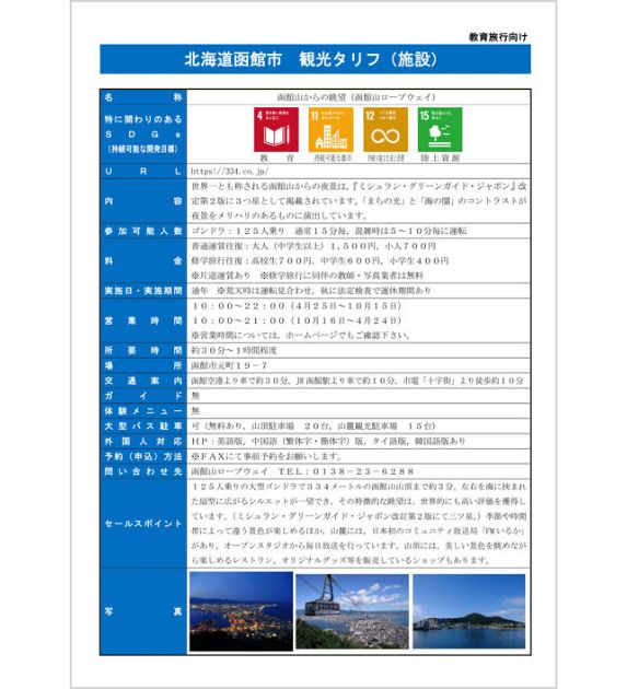 函館をはじめとする「みなみ北海道」は、歴史や文化が息づく施設の宝庫であるとともに、北海道ならではの雄大な自然も身近にあり、教育旅行(修学旅行)に人気のエリアです。みなみ北海道教育旅行ルートガイド「ぐる~と教育旅行版」、函館市内の施設の情報をまとめた「観光タリフ」などを、事前検討や資料作りにご活用ください。