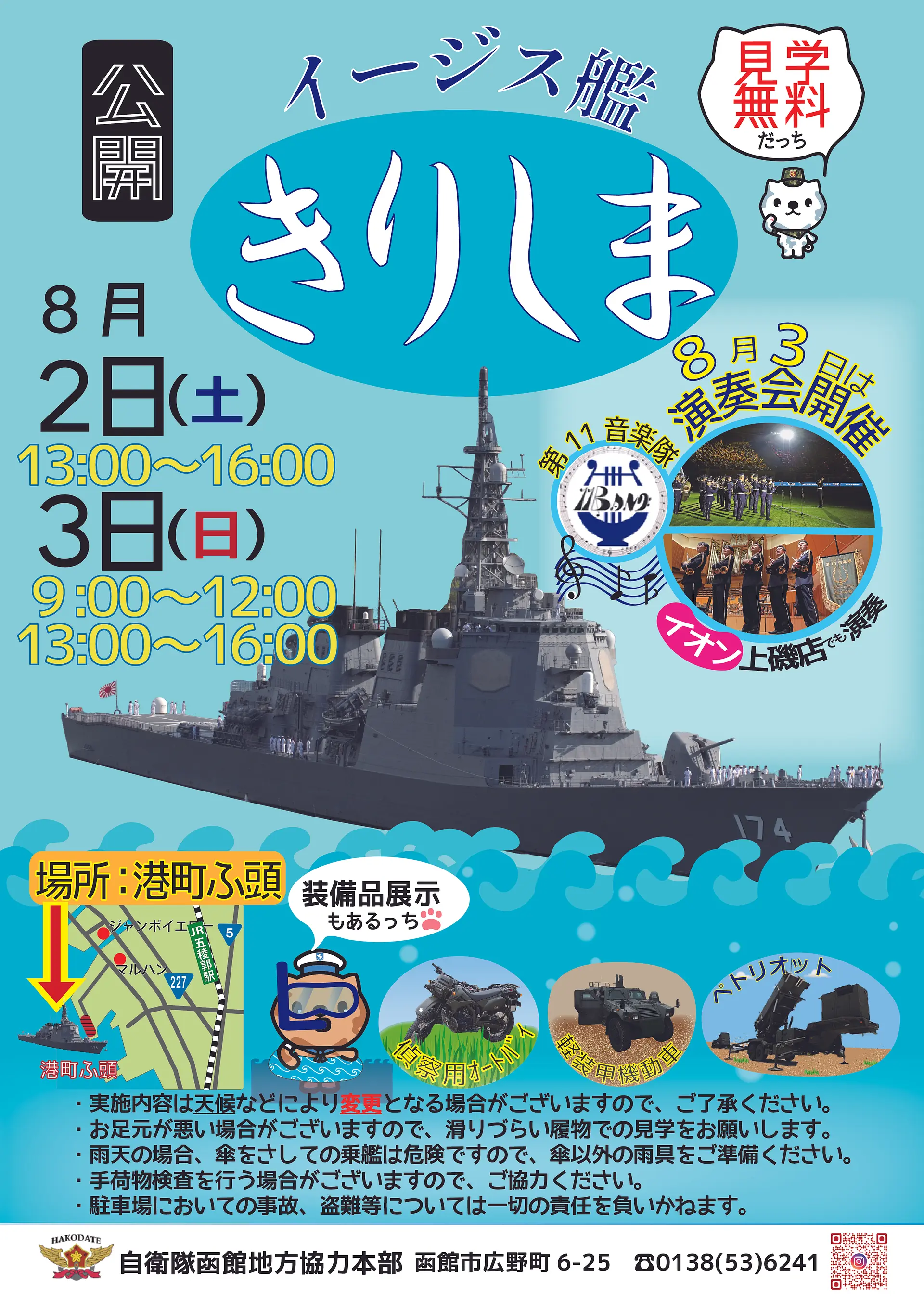 JR函館駅から車で10分の港町埠頭で、海上自衛隊の護衛艦「きりしま」を一般公開。事前申し込み不要、入場無料。