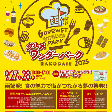 JR函館駅近くのはこだて(大門)グリーンプラザと、太陽パーキングを会場に、函館とつながりのある日本各地のグルメが集合。ご当地グルメのテントがずらりと並ぶ、函館最大級の食のイベントです。長年「はこだてグルメサーカス」として親しまれてきましたが、2025年から「グルメワンダーパーク函館」としてリニューアルされました。