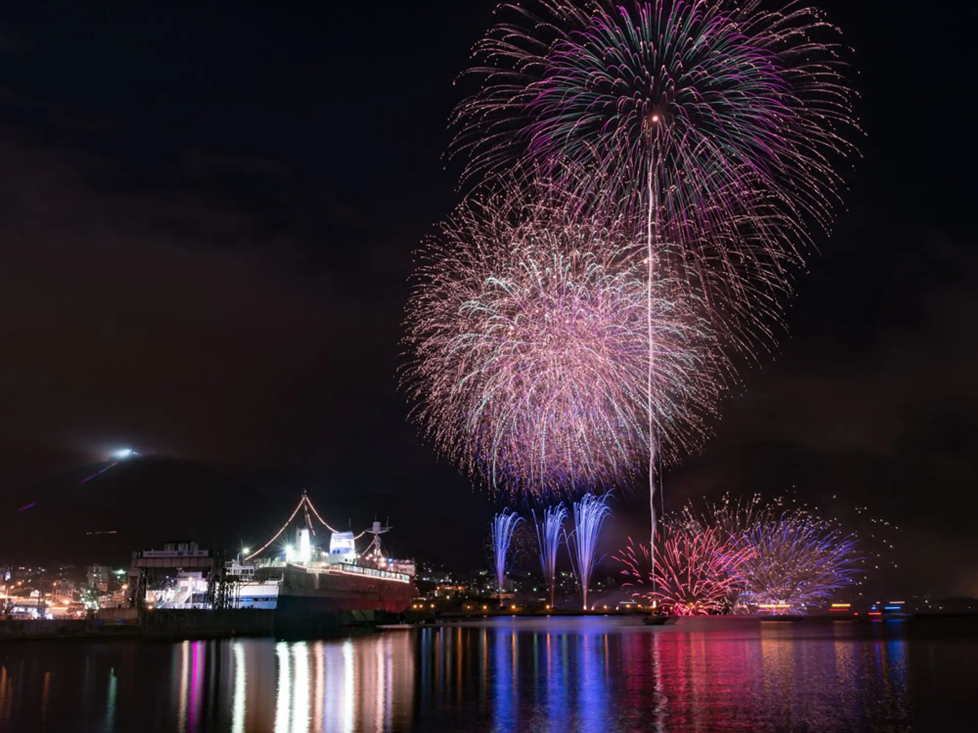 函館の夏の一大イベント、函館港まつり。初日の8月1日は、港に打ち上げられる迫力満点の花火大会を開催。北海道新聞社主催で、北海道内最大規模の花火大会。