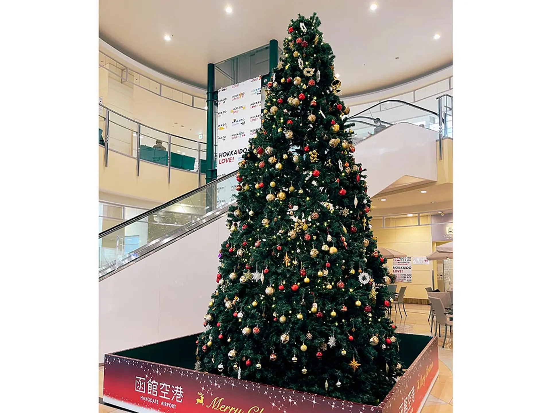 函館空港の国内線旅客ターミナルビルで12月初めに開催される「函館空港クリスマスマーケット」。高さ5メートルのクリスマスツリーが1階中央ホールに登場し、華やかに利用者を出迎えてくれます(12月25日まで設置)。