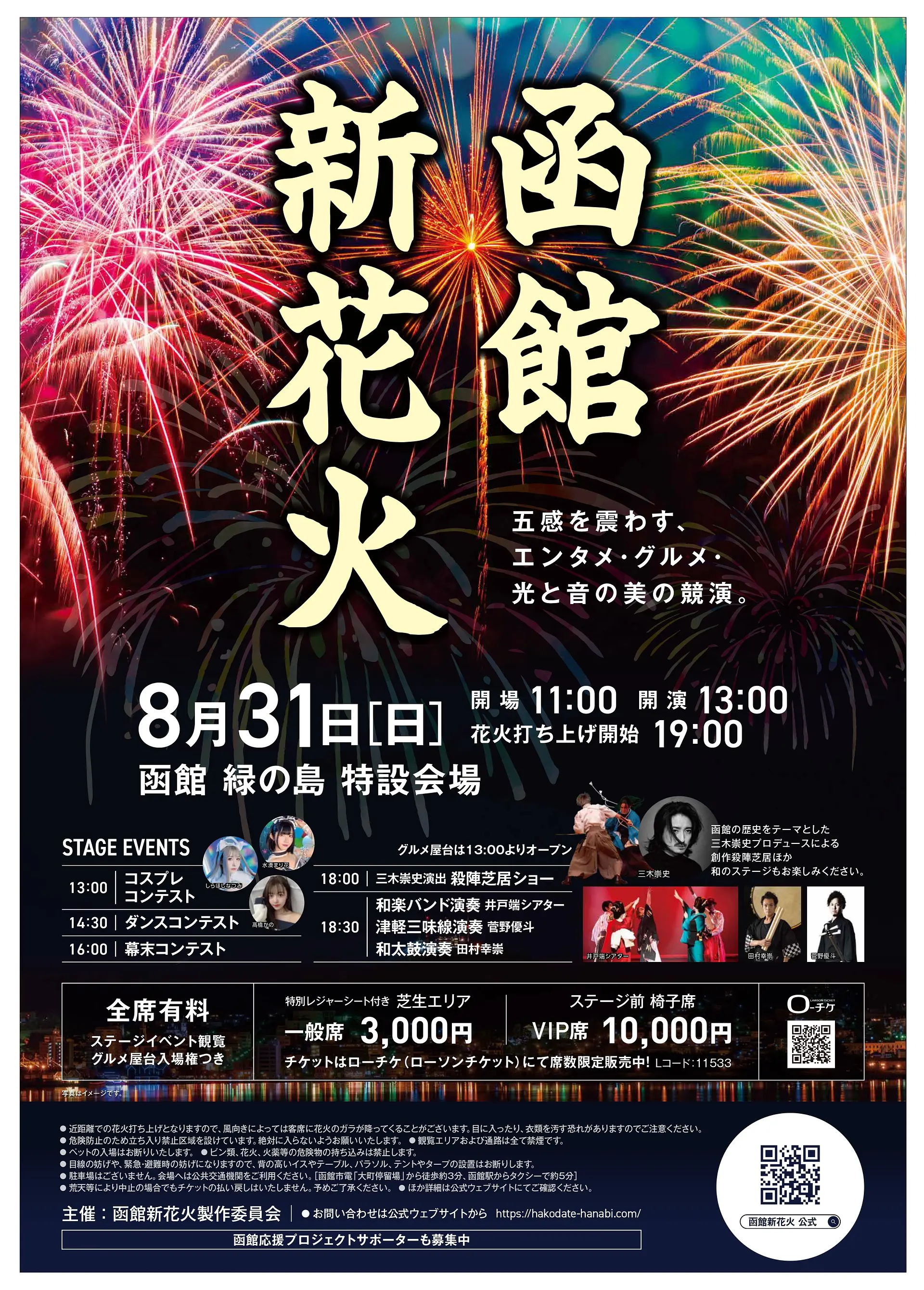 主催は「函館新花火製作委員会」。市内で居酒屋を営む西田圭佑さんと、2019年の箱館五稜郭祭「土方歳三コンテスト全国大会」優勝者で俳優の三木崇史さんを中心に、民間の力で実現しました。緑の島に有料観客席を設けて実施する、函館では新たな形式の花火大会です。
