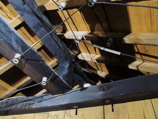 屋根最上部の端から端まで渡る「棟木」、それを支える「束」や「梁」、屋根板を支える「垂木」などに焦げ跡や炭化の跡があります。これらの木組みに使われているのは、丈夫なヒノキ(あるいはその仲間のヒバ)だそうです。屋根板や垂木の一部は修復されています。