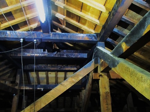 屋根裏の小屋組みの木に、黒々と残る焼け跡。