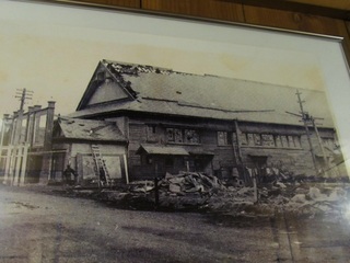「大火資料室」には、当時の被害状況がわかる街の写真が展示されています。その1つ「僅かに全焼を免れたる錦座惨状」は、建物は別のものですが、似たような焼け方をしている写真で、状況を類推する資料として貴重(下左)。建物はそれほどダメージを受けていませんが、屋根の上部を火が走ったようで、激しく焼けているのがわかります。