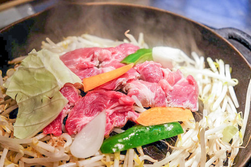 おひとり様でも気軽に食べられる、卓上の鉄板鍋で焼くスタイル。ロール肉と焼き野菜、ご飯・味噌汁などの食べ放題コースが人気。