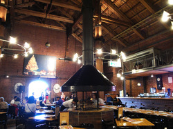 ラム肩ロース400gをどーんと鉄板焼きスタイルで出す名物メニュー「ジンギスカンビヤホール風」。明治の面影が残るレンガ倉庫で、自家醸造ビールのジョッキを片手に。