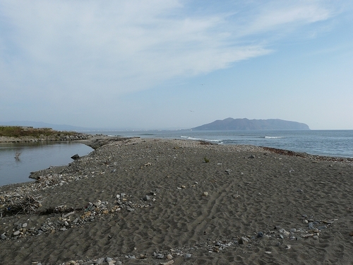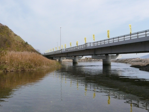茂辺地川は函館湾に流れ込む河川。すぐ上を国道228号線が通る河口付近からは、海越しに函館山が見えます。