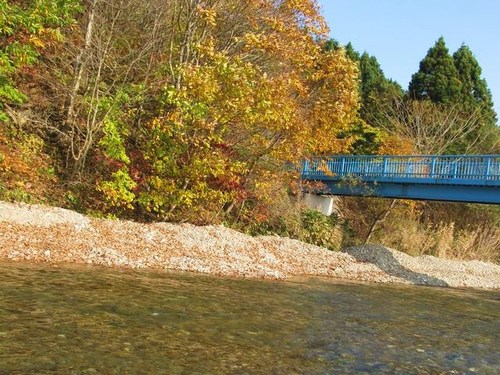 橋に上がってみると、紅葉の時期には木々の赤や黄色がひときわ美しく迫ってきます。川に映りこんでいる色まで、とても鮮やかです。さて、下のほうに目をやると......! !