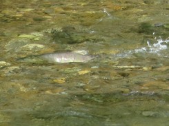 長い旅をしてふるさとの川に帰ってきた鮭。ウロコがはがれているのか、ところどころが白っぽく見えます。川に上るとすぐに産卵するようなイメージがありますが、意外にも川の中で一定の範囲をぐるぐると泳ぎ回っています。よく観察してみると、オスとメスがそれぞれ近寄っていったかと思えば離れていくのが何度となく繰り返されています。産卵のパートナーを探しているのでしょうか。