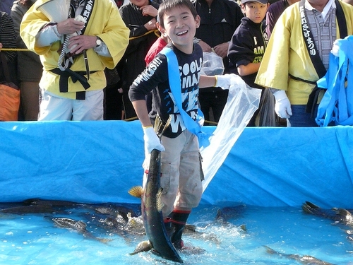 水槽に放された生きのいい鮭を追って、長靴持参でやってきた子どもや大人から大歓声が。獲った鮭は、配布されるポリ袋に入れて持ち帰ることができます。