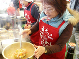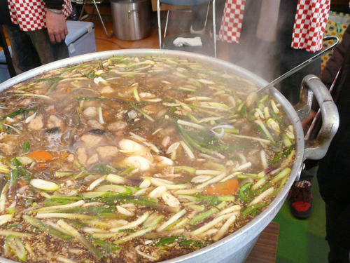 今年は初めて奥尻島からも出店がありました。ゴッコ、ホッケのすり身、モツ、行者にんにく、ねぎ、ふのりなど、具だくさんの「奥尻ちゃんこ」。初参加ながら、出店者の中で最も巨大な鍋を持ち込むという気合いの入りようで(一番上の写真)、参加した鍋料理の中で人気を競う「N-1(なべワン)グランプリ」では、見事初代優勝に輝きました! |