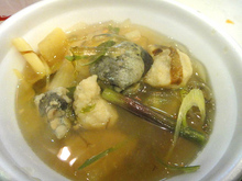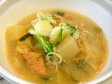大根や人参などの野菜と魚が入った「三平汁」は、道南地方発祥の北海道の郷土料理。家庭でもよく食べられる汁物ですが、これは「江差産のサケとスケソウダラ入りだよ」とお店の方。何気なく地産地消です。 |