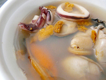 これでもかというくらいにウニやら貝やらが入っている「浜鍋」。塩味の汁は、まさに海の味です。 |