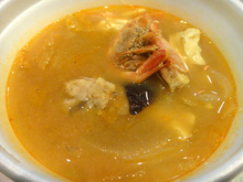 「るもい萌え鍋」は、新鮮なエビが入ったトマト味のスープ仕立て。エビの殻でとった濃いだしがポイント。 |