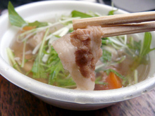 ただの豚汁と一緒にしないで!と鍋から聞こえたような気がして、ついつい引かれたのは「フルーツポーク鍋」。フルーツの入った鍋ではなく、江差のお隣・上ノ国町で、フルーツを飼料に混ぜて飼育している豚が入っています。「甘みがあって柔らかい肉質が特徴」との言葉通りの味で大満足。今まで知らなかった特産品に出合うのも、なんだか得した気分です。 |