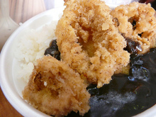 汁物が並ぶ中でひときわ異彩を放っていたのが「いかすみカレー」。遠慮のかけらも感じられないくらい真っ黒ですが、カレーの味は意外と本格的。ぷりっぷりのイカフライにルーをからめて食べると、また美味。町内のアンテナショップ「ぷらっと江差」のスタッフの方が考案したメニューで、今後ゴーサインが出れば商品化されるかも......?とのことでした。 |
