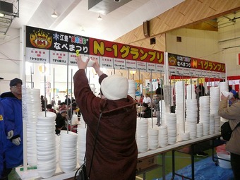このN-1グランプリ、各自が食べ終わったどんぶりの空容器をおいしかったと思うメニューのところに置いて、その数を競うもの。第11回が初めての試みで、1位が圧倒的人気で「奥尻ちゃんこ」、2位が「カキ鍋」、3位が「るもい萌え鍋」でした。