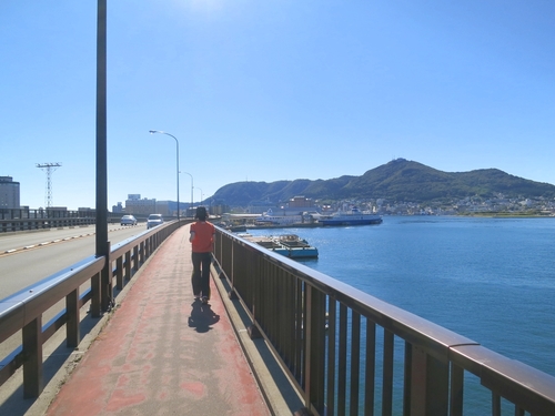 ともえ大橋は、函館港に沿って走る全長約2キロの高架道路。海側に広めの歩行者用通路があり、海を近くに感じられます。正面には函館山。函館マラソンのコースにも組み込まれている絶景ポイントです。