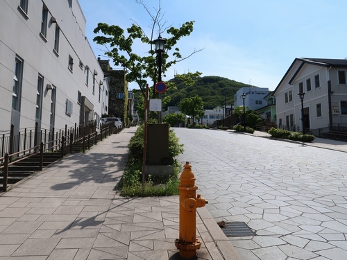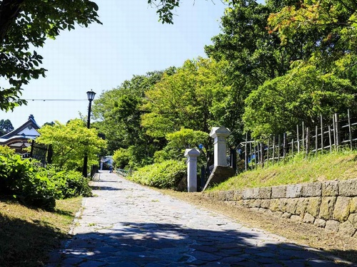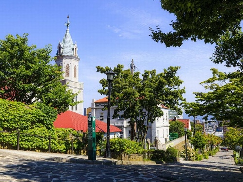 八幡坂のつきあたりから左へ横移動すると、カトリック元町教会の美しい建物が目に入ります。目の前の大三坂は「日本の道100選」に選ばれた美しい石畳の坂です。