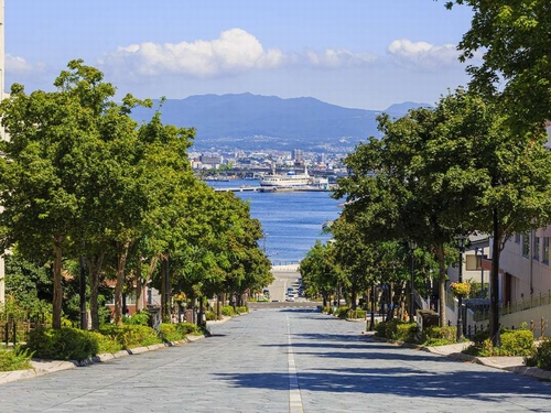 長さ約300メートル、最大斜度8.3°......坂上にたどり着いて振り向くと、こんなごほうびが! 函館のビュースポットとして一番人気の絶景が広がります。