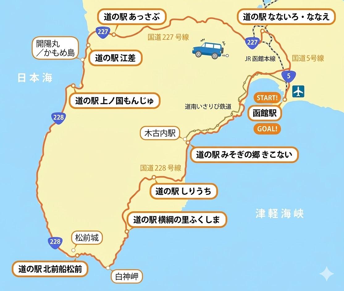 ▲みなみ北海道・道の駅巡りドライブ ルートマップ 周遊約250km・運転時間約5時間