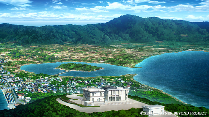 2004年のTV放映から劇場版やTVスペシャルなど長きにわたって展開する、未知の生命体「フェストゥム」と少年少女の戦いを描いた壮大なSFロボットアニメーション作品(THE BEYONDは5作目)。前作「EXODUS」のラストから物語の舞台となっている孤島・海神(わだつみ)島は、函館がモデルです。第三話、島に帰還するシーンの上空からみた海神島。