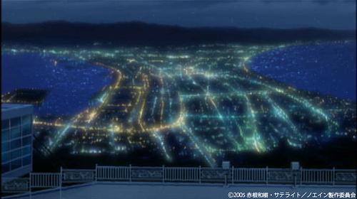第五話、第六話エンディングのワンシーンでは、海と星空、正面には函館山のシルエットと西部地区に灯る平和な街あかりが見えます。
