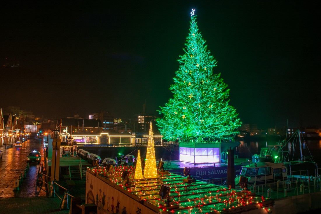 「はこだてクリスマスファンタジー」は、金森赤レンガ倉庫前の海上に浮かべた台船の上に高さ約20mの巨大クリスマスツリーを立て、美しいイルミネーションで飾るイベント。毎日の点灯時には、花火が上がります。