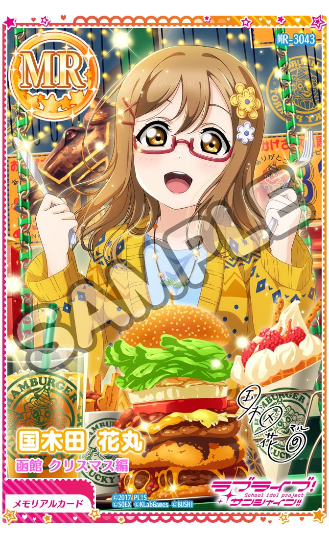 ラッキーピエロは、函館と周辺に17店舗を展開するご当地手作りハンバーガーレストランチェーン。TVアニメ2期第8話・9話にベイエリア本店が登場し、どちらの回でもストーリーを展開するうえで重要な話し合いが行われました。そんななか、マイペースにボリューム満点の「ザ・フトッチョバーガー」にかぶりついていたのが国木田花丸ちゃん。メモリアルカードでも、THEフトッチョバーガーを中心に、ラキポテ、ウーロン茶、野いちごシルクでお食事中。