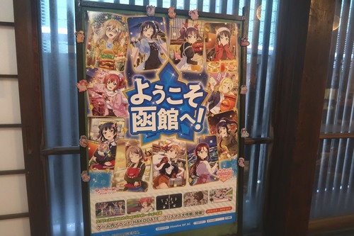 また、「ラブライブ!スクフェスAC」函館クリスマス編カードをデザインした「ようこそ函館へ!」ポスターも作成され、メモリアルカードの舞台となった施設などに掲示されています。(写真は茶房 菊泉)
