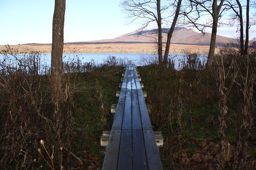 湖畔には、湖へ通じる木道も設置されています(大沼湖畔一周道路)。春になると、周囲の湿地にはミズバショウやスイセンが群生し、白樺の木々や草花たちが湖へと誘ってくれているようにも感じます。木道から見る湖と駒ヶ岳の眺めは秀逸。路肩には駐車スペースも設けられていますので、ドライブの途中でぜひ立ち寄ってみてください。