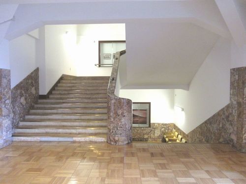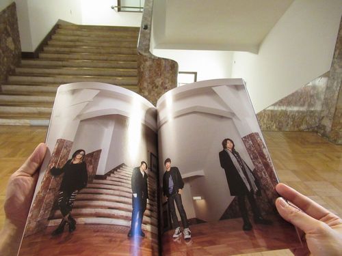 階段や天井の高い室内など、レトロな趣きのある建物は、自由に見学することができます。階段ではいくつかのカットが撮影されていますが、階によって掲示物が違いますのでチェックしてみましょう。現場には撮影場所の案内表示もあります。メンバーそろっての大きなカットは、2階からと4階への階段をバックに、3階で(この記事の2番目の写真参照)。