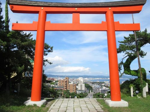 正面石段上の真っ赤な鳥居がビューポイント。坂の突き当たりに位置するため、振り返ると、函館の市街地と津軽海峡が一望できます。