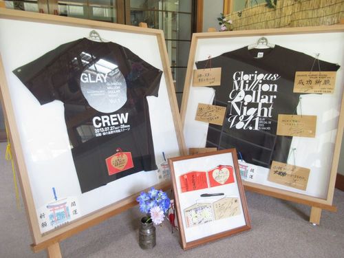 こちらは、2013年の緑の島ライブ前に、メンバー直筆の絵馬が奉納された神社。社務所の玄関には、その時に書かれた絵馬とTシャツが展示されています。