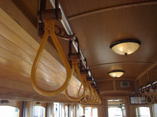 赤いシート、自然素材のつり革、木製の天井などがハイカラ號の特徴。