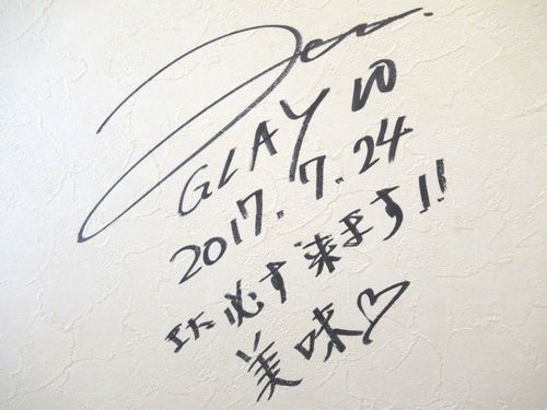 地元で人気のラーメン店。今回のGLAY Walkerには掲載されていませんが、2017年7月にTERUさんが来店し、店内の壁にサインを書いていったことで話題となりました。