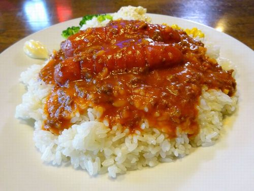 山盛りのバターライスの上に、グリルしたソーセージがのり、その上からたっぷりとミートソースのかけられた「シスコライス」が人気。