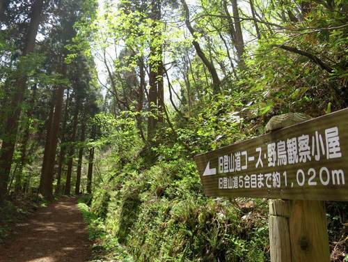 歩行者用の旧登山道は、最初のほうは車道と交差しているので、気をつけて横断します。3回横断したら、いよいよ車道と別れて、スギ林の中へ。